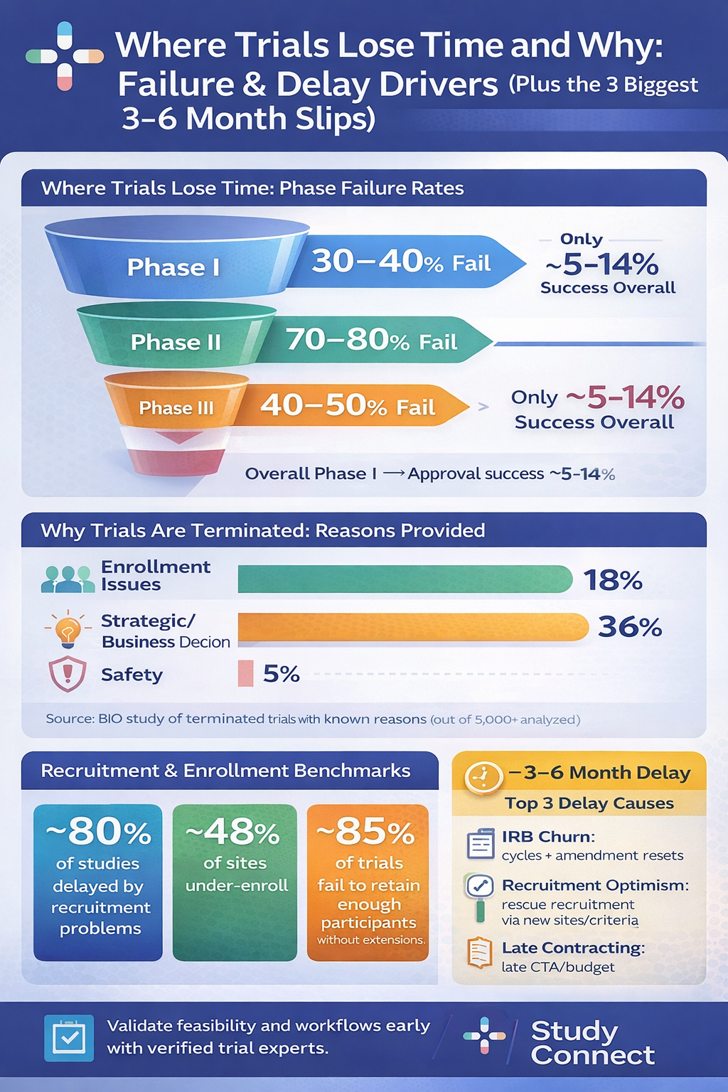 - Strategic/business reprioritization (often tied to weak execution signals)Remember the termination data: enrollment issues cited in ~18% of Phase II/III terminations with reasons provided, and strategic/business decisions at ~36% (Nature Reviews Drug Discovery).