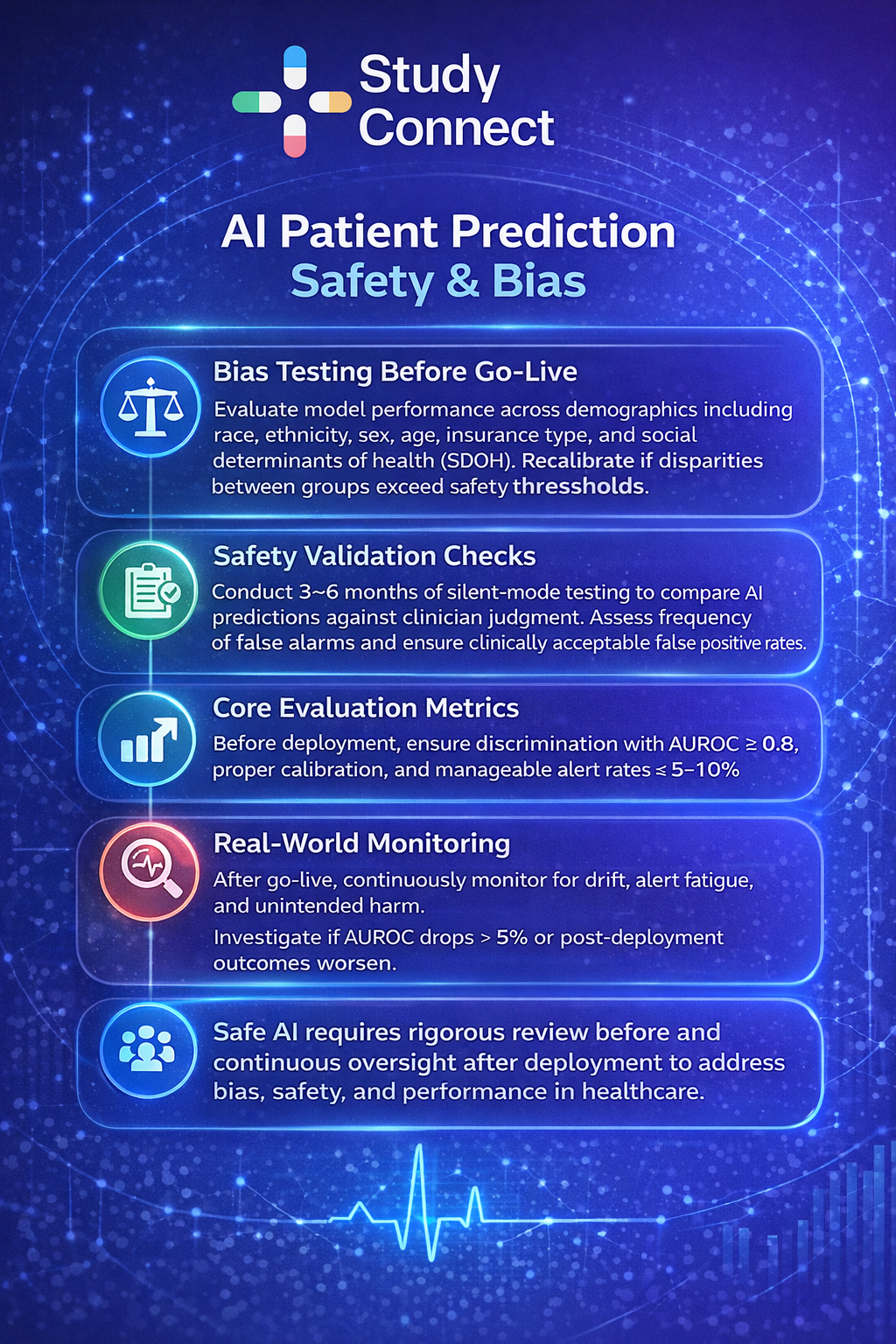 · Data drift: patient mix changes(seasonality, COVID-like shifts)