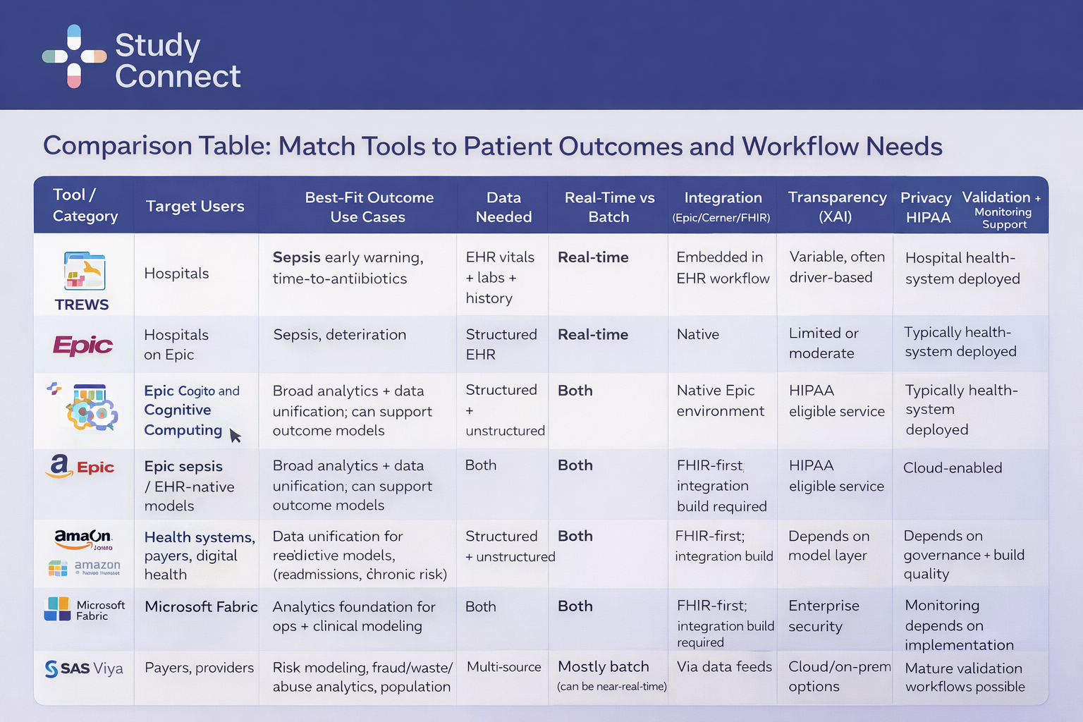A “tool” may be an EHR-native model, a third-party analytics platform, or a custom-built ML system. The right choice depends on your data maturity, governance capacity, and whether you need real-time bedside support or population-level risk management. Ultimately, the best tool is not the most complex algorithm. It is the one that integrates smoothly into workflow, is governed safely, and leads to measurable improvements in patient outcomes.