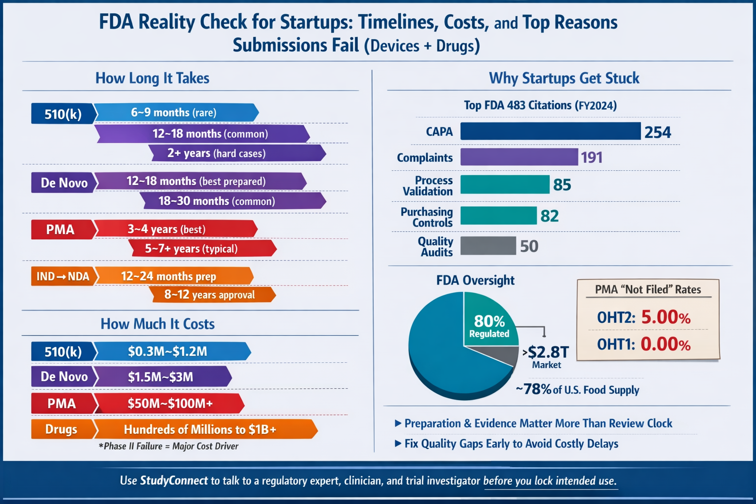 Manufacturing and quality also matter earlier than most startups expect. For device companies, FDA inspections frequently cite basic quality system gaps like CAPA and complaint handling (see data later in this guide).